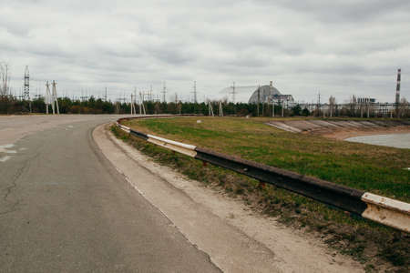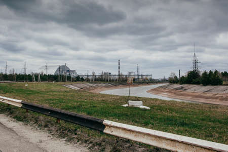 Chernobyl alienation zone. View of Chernobyl atomic plant background river.