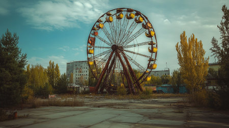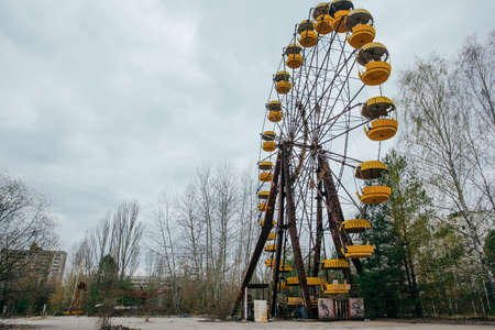 Abandoned carousel and abandoned ferris at an amusement park in the center of the city of Pripyat, the Chernobyl disaster, the exclusion zone, a ghost town