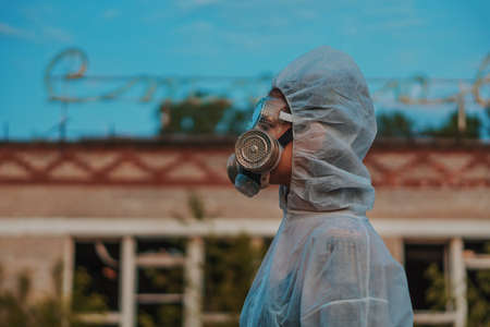 The scientist put on a respirator and a white protective suit against radiation. Close-up profile of a girl who cares about ecology.