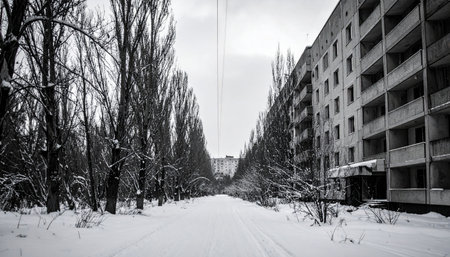 A silent, snow-covered street in the abandoned city of Pripyat, Ukraine. This black and white photograph captures the haunting stillness of the Chernobyl Exclusion Zone in winter, where nature slowly reclaims the decaying Soviet-era architecture, a somber reminder of a past catastrophe.