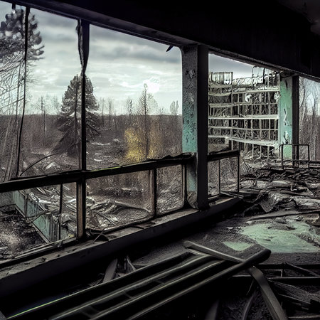 Abandoned buildings in Pripyat, Chernobyl, decaying structures, overgrown with vegetation, eerie atmospheric tones, detailed linework Generative AI