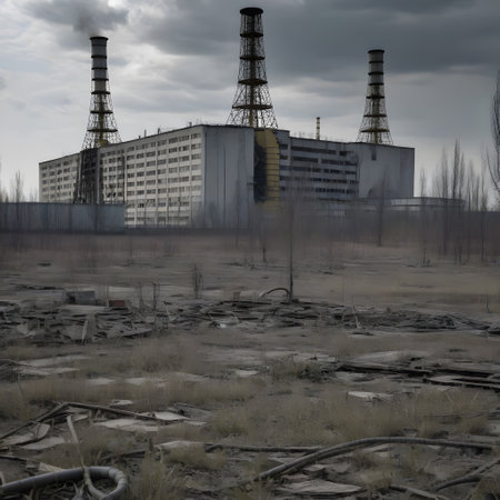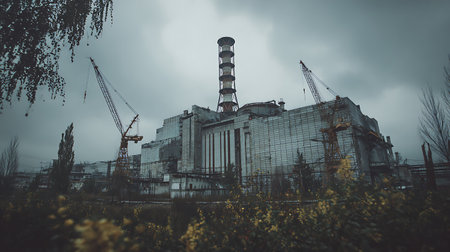 Depicts the Chernobyl Nuclear Power Plant and cranes, a stark reminder of the 1986 disaster in Pripyat, Ukraine, captured on a dark and overcast day.