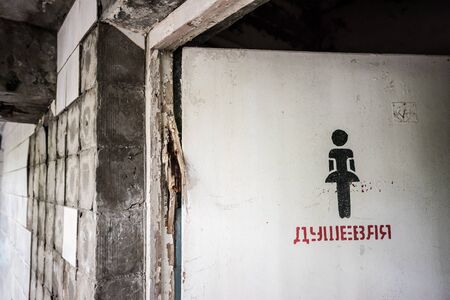 Sign on a door in abandoned swimming pool in Pripyat school, Chernobyl, Ukraine