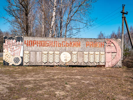 Pripyat, Ukraine - APRIL 15, 2019: sign welcoming visitors of Chernobyl city, Dead city Pripyat. Chernobyl now touristic attraction in popular Chernobyl tours (Translation of text in cyrilics: Pripyat)