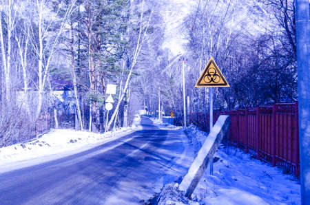 biohazard warning sign on the background of a streetscape in a blue color scheme