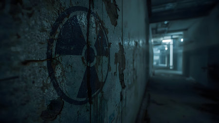 A weathered radiation symbol marks a wall in a long, dimly lit, abandoned hallway. The stark contrast of the radiation symbol against the crumbling wall evokes a sense of danger and decay, a haunting reminder of a forgotten disaster.