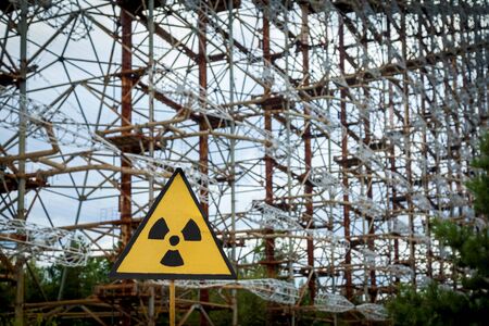 Radiation warning sign in front of Duga, a Soviet over-the-horizon (OTH) radar system as part of the Soviet anti-ballistic missile early-warning network, inside the Chernobyl Exclusion Zone in Ukraine