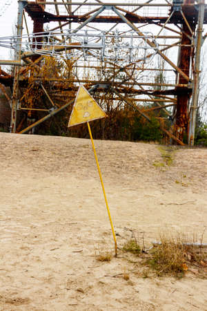Radiation sign on the former military radar system of the Duga in the Chernobyl Exclusion Zone, Ukraine