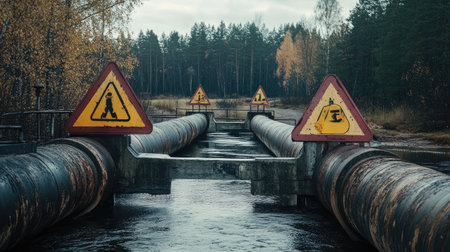An industrial pipe system crosses a calm river, highlighted by caution signs. The surrounding nature exhibits autumn colors, blending industry with tranquility.