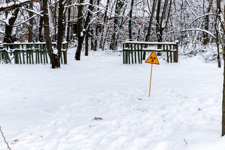 Radiation warning sign in Chernobyl Exclusion Zone in Ukraine