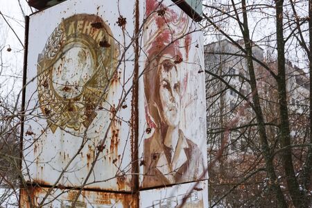 Soviet agitation stand in ghost town Prypiat. Collapsing buildings in Pripyat, Chornobyl exclusion zone