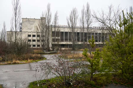 Pripyat, Ukraine - April 25 2019: Inscription Palace of Culture Energetik . Abandoned building in Pripyat. Sign Energetik on the roof of the building. Exclusion Zone, Chernobyl, Pripyat