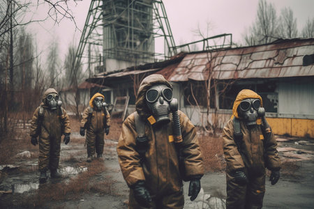 Infected area. People in protective suits and gas masks. radiation danger. Generative AI.
