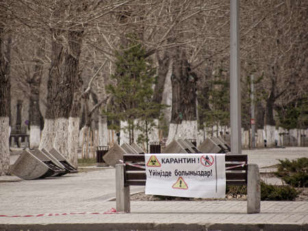 The streets of the city are quarantined closed due to COVID-19 outbreak lockdown. Information warning sign about quarantine measures in public places
