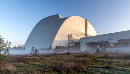 View to sarcophagus covering the damaged fourth reactor at the Chernobyl nuclear power plant, Ukraine.