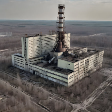 Generative AI Exterior view of the Chernobyl nuclear power plant, broken windows, worn-out structures, desolate landscapes, atmospheric watercolor depiction