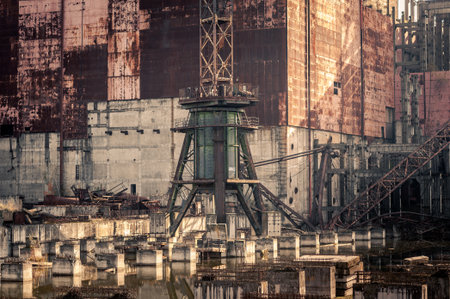 Chernobyl Nuclear Power Plant after atomic reactor explosion. Tower of the fourth nuclear reactor