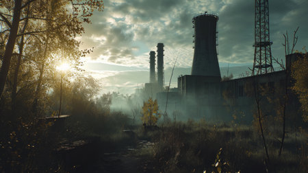 Generative AI Overgrown areas around Chernobyl's reactors, nature reclaiming, desolate landscapes, moody atmospheric tones, realistic depiction