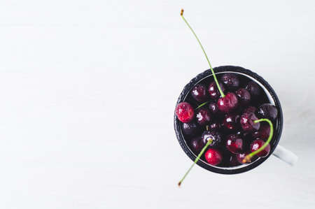 Top view of fresh raw cherrries in coffee cup on white background, space for text. Minimal refreshing with healthy eating concept
