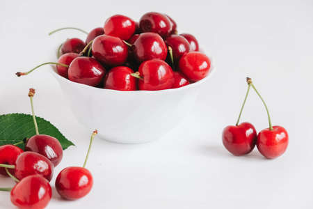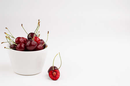 A plate with ripe cherries is placed on a white background with space for your text.Fruit background.