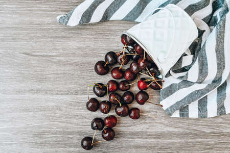 Cherries spilled from white bucket on wooden background, side view. Kitchen towel. Spring harvest. Healthy eating. Fruits. Pie ingridient. Copy space