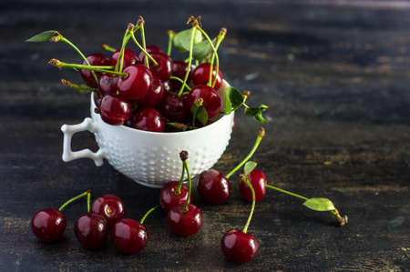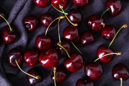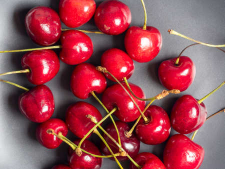 top view of juicy bright sweet cherries on a dark background. Healthy food, flat lay