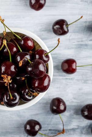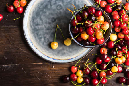 Fresh organic sweet cherries on ceramic bowl with copy space