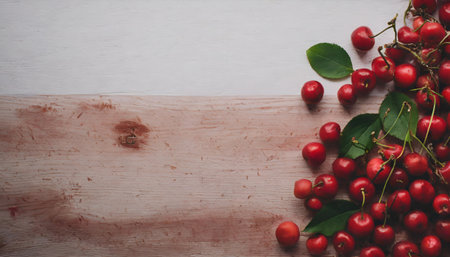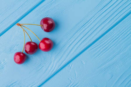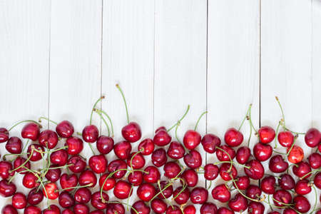 Red cherries on white wooden background. Berry healthy snack horizontal photo top view with space for text