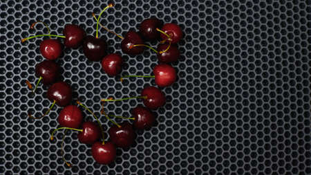 hollow heart of red cherries close up from above against a dark background. High quality photo