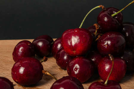 Cherry tree macro black background top view. Ripe juicy cherry berries in drops of water are lying on the table. The concept of freshness, proper nutrition, vitamins. Low key photo. Copy space