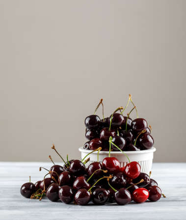 Black cherries in a bowl on grungy and grey gradient background. side view.