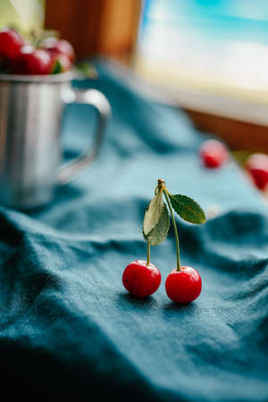 Ripe cherries in a mug. Good Morning Concept Cottagecore Aesthetics. Rustic, vintage style. Selective focus. Macro
