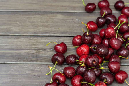 Juicy cherry on a wooden background. Red freshly picked cherry.