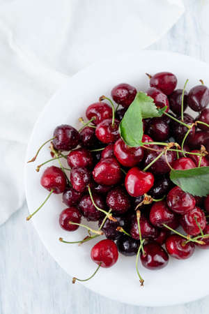 Fresh juicy red cherries in a white plate on the white wooden background. Copy, empty space for text.