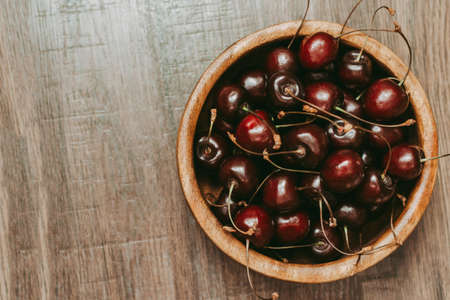 Fresh organic cherries from the home orchard. Freshly picked healthy fruit in a rustic wooden bowl on a vintage wooden table. A symbol of a healthy diet.