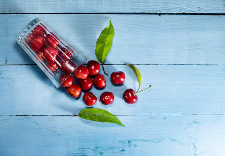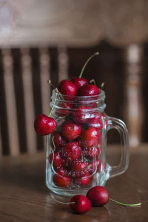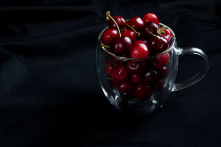 Ripe cherry in a transparent glass. close-up. Vitamins.Healthy nutrition.