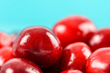 Beautiful juicy sweet cherries background. Close up of pile of ripe cherries. Minsk, Belarus.