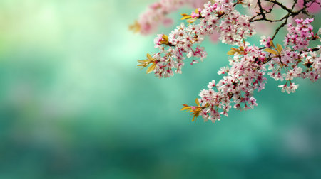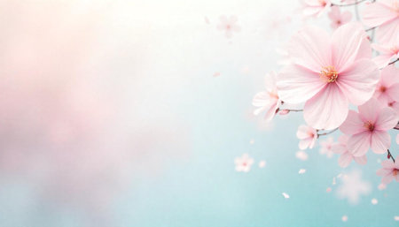A tranquil gradient background blends softly with the blooming pink cherry blossoms, creating a peaceful atmosphere. This springtime moment captures nature's beauty.