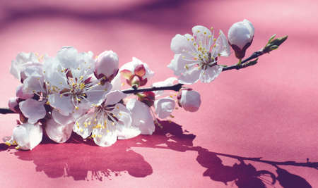White apricot flowers on a pink background. Annual New Year.