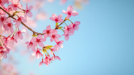Pink cherry blossoms blooming on a branch against a clear blue sky, celebrating the arrival of spring. Ai generated image