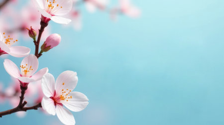 branch of blossoming cherry blossom on light blue background, empty space for text, spring floral arrangement with creamy bokeh, greeting holiday card or beautiful wallpaper
