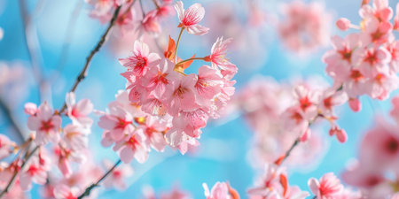 Beautiful horizontal banner showcasing pink sakura blossoms against a clear springtime blue sky