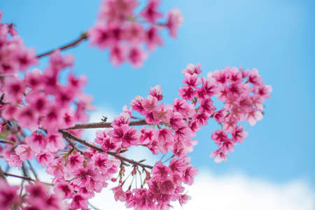 Beautiful Pink Cherry Blossom or Sakura flower blooming in blue sky on nature background