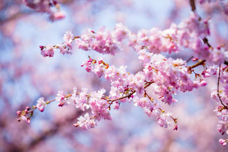 Sakura Pink in soft focus, beautiful cherry blossom in Japan, bright pink flowers of Sakura on the blurry background. Spring background and beautiful natural scenery.