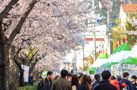 Jinhae,South Korea-April 2, 2019 : People walk at Jinhae Gunhangje Festival on April 2,2019 It is Korea's biggest spring festival surrounded by unbelievably stunning cherry blossoms every year.