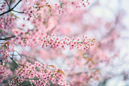 Blossom branch peach pink flowers or Phaya Suea Krong flowers . Wild Himalayan Cherry, scientific name prunus cerasoides, is a plant that belongs to the genus Prunus.