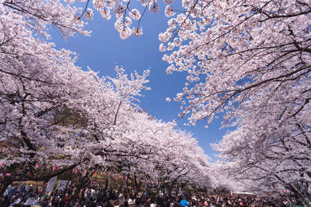 Cherry trees in full bloom in Tokyo, Japan. Cherry blossom season in Tokyo.