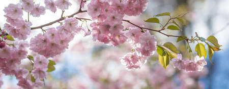 blooming cherry tree or sakura blossom branches with blur floral background. landscape panorama, copy space. Beautiful spring flower abstract nature.