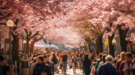 Japanese sakura Cherry blossom festival, rear view of young woman in park during spring with crowd enjoying the atmosphere, AI generated
