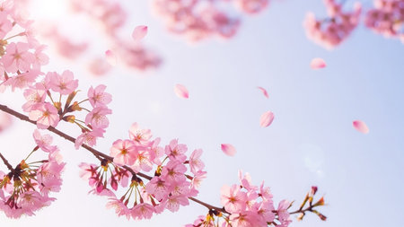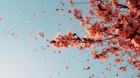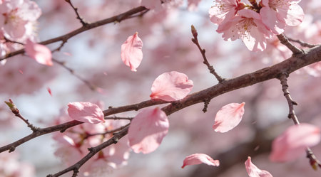 Branches showing delicate pink cherry blossoms bloom on branches against a soft blue sky with falling petals keywords: cherry blossom, sakura, pink...